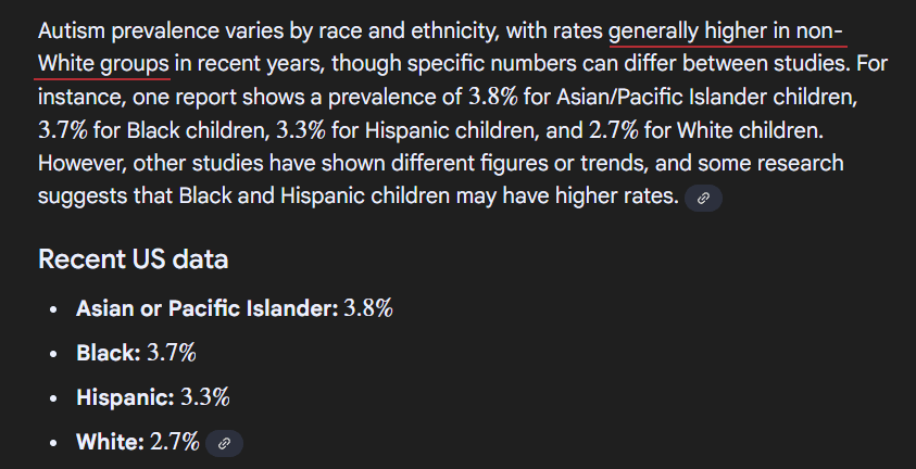 Autism is not a bad thing necessarily. It certainly can be, but the smart as a whip autistics are useful both to themselves and others. Aspergers got lumped in with drooling autists. I suspect more of those are white.