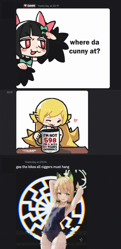 >>303833>nobody here cares about lolishit or guro.We have a bunch of threads about loli and how good it is. But yes people who are in to "ironic weeb fascism" , chinky gachashit, and hurtcore need to stay on Discord.
