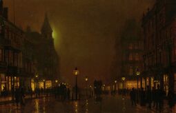 >>62210 briggate shopping district of leeds, england. the artist, atkinson grimshaw, has loads of similar works from later on in his career, foggy london urban and landscape paintings. he was a very successful artist from the start so probably everyone had something good to say about it